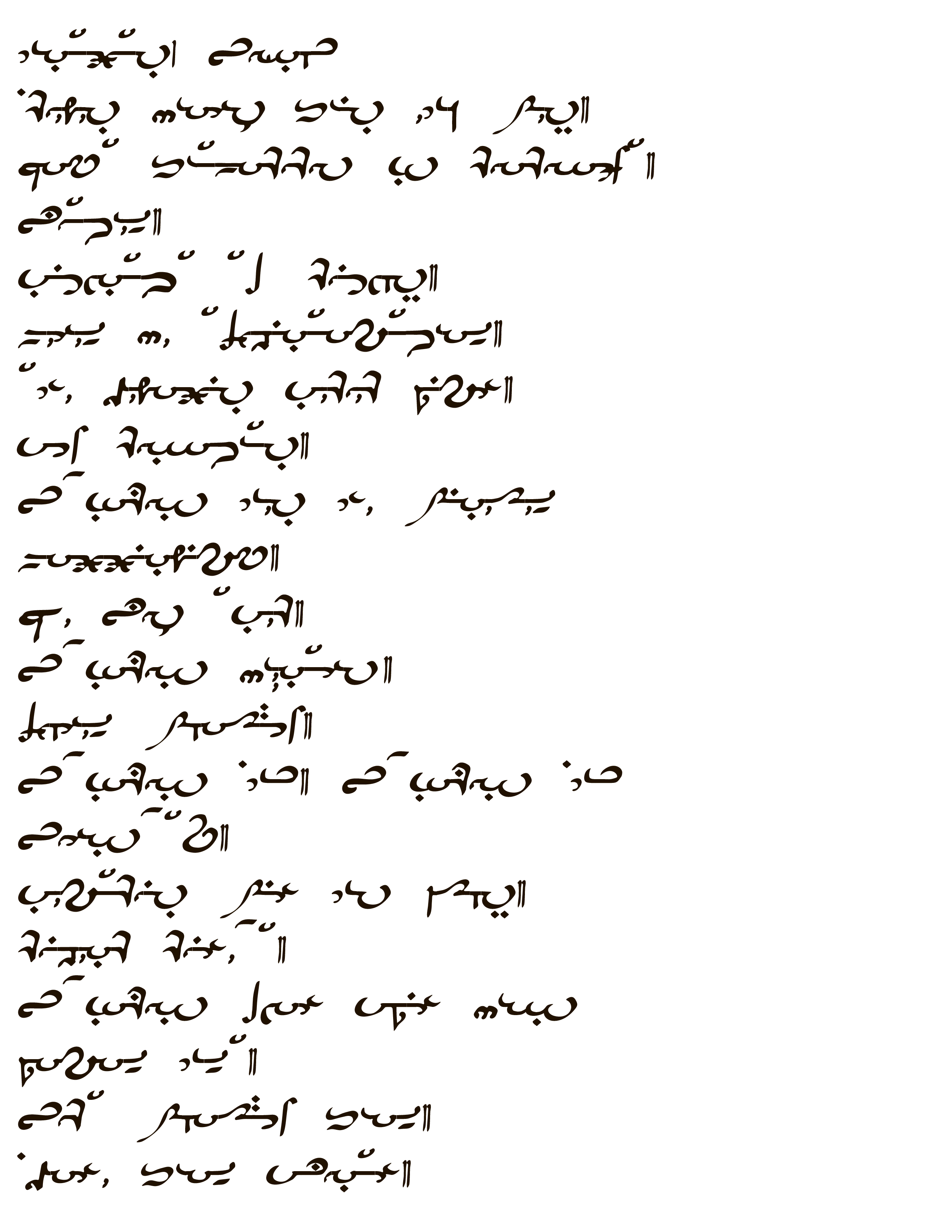 Below is a large sample of Ta'agra script, to give an example of how it looks when a substantial amount is written together. What is written below are S'rathra's responses to Cyrus spoken in Ta'agra. You can find the link to the video and the analysis of the conversation on the Source Documents page.